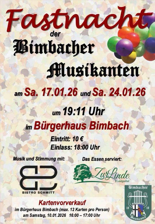 17.01. und 24.01.2026 Fastnacht der Bimbacher Musikanten